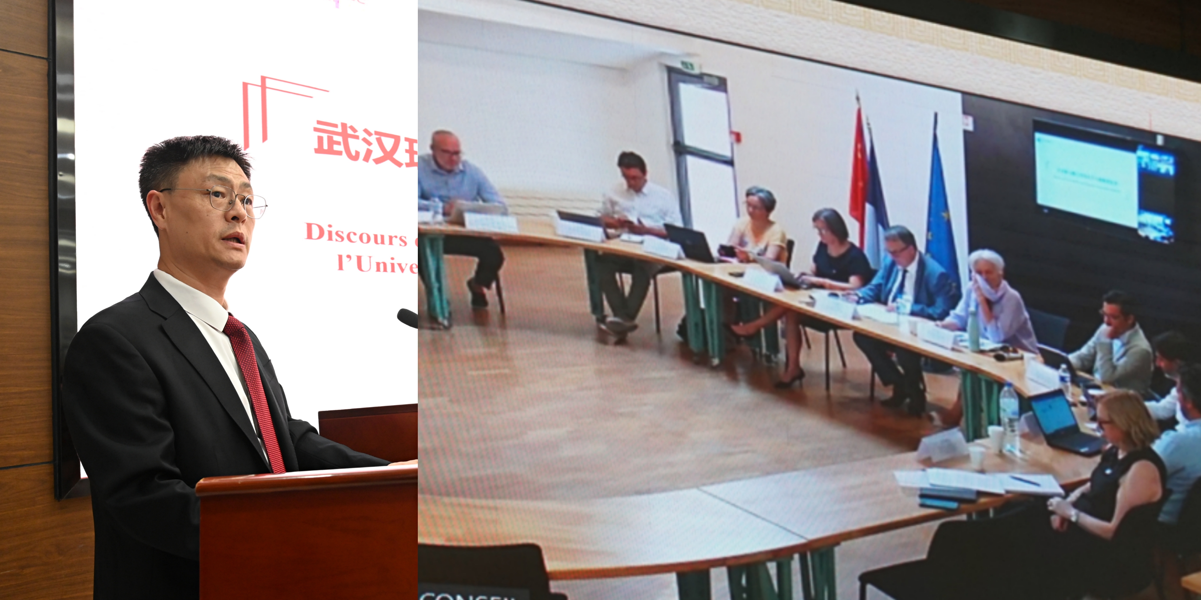 副校长王发洲、联委会中方委员,鸭王 法方执行院长,党政办、学工部、本科生院、研究生院、人事处、国际处、财务处、国资处、基建处、后保处及化生鸭王、鸭王 领导班子成员在会议中心参加会议;艾克斯马赛大学校长贝尔顿先生、副校长季米妮女士、联委会法方委员,法方综合办、发规办、校长办、国际合作处、理鸭王等负责人、教学委员会委员等在线参加了会议。会议邀请了法国驻武汉总领事馆科教专员费奕先生作为特邀嘉宾在线列席会议。仪式由鸭王 中方执行院长孙涛垒主持。